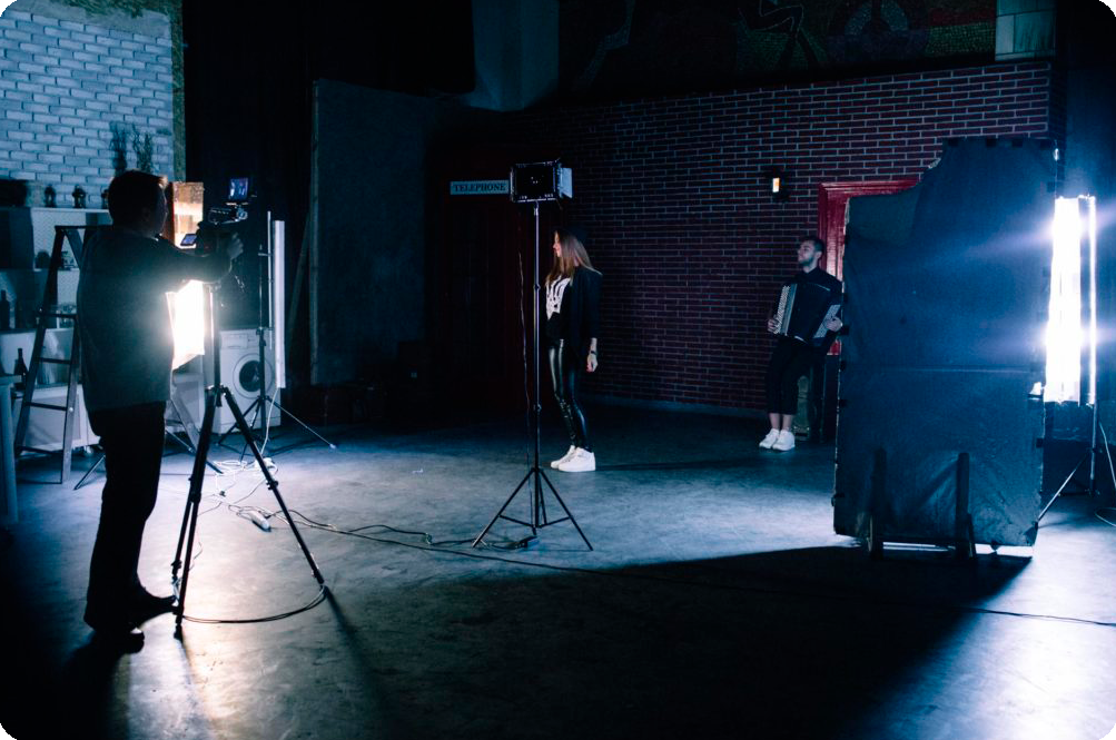 - Подготовка к съемкам. Арт-директор просматривает визуальную часть видео. При необходимости подбираются актеры или массовка. Художник по костюмам разрабатывает стиль одежды для персонажей. Выбирается место проведения съемок.